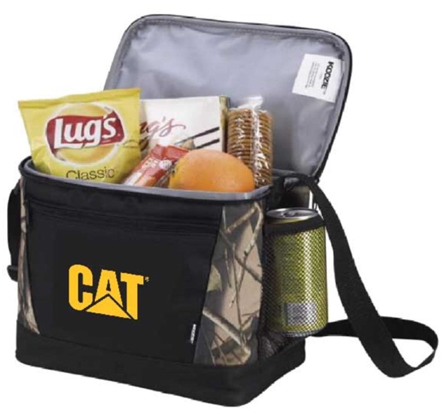 This unique camouflage cooler bag with a zippered main compartment, front zippered pocket and side mesh pocket. Top carry handle and adjustable shoulder strap
