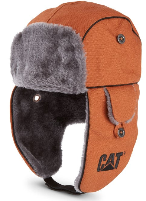 Enzyme-washed saddle-canvas exterior, faux-fur interior, ear flaps, lowered neck, and black piping. One size fits most.